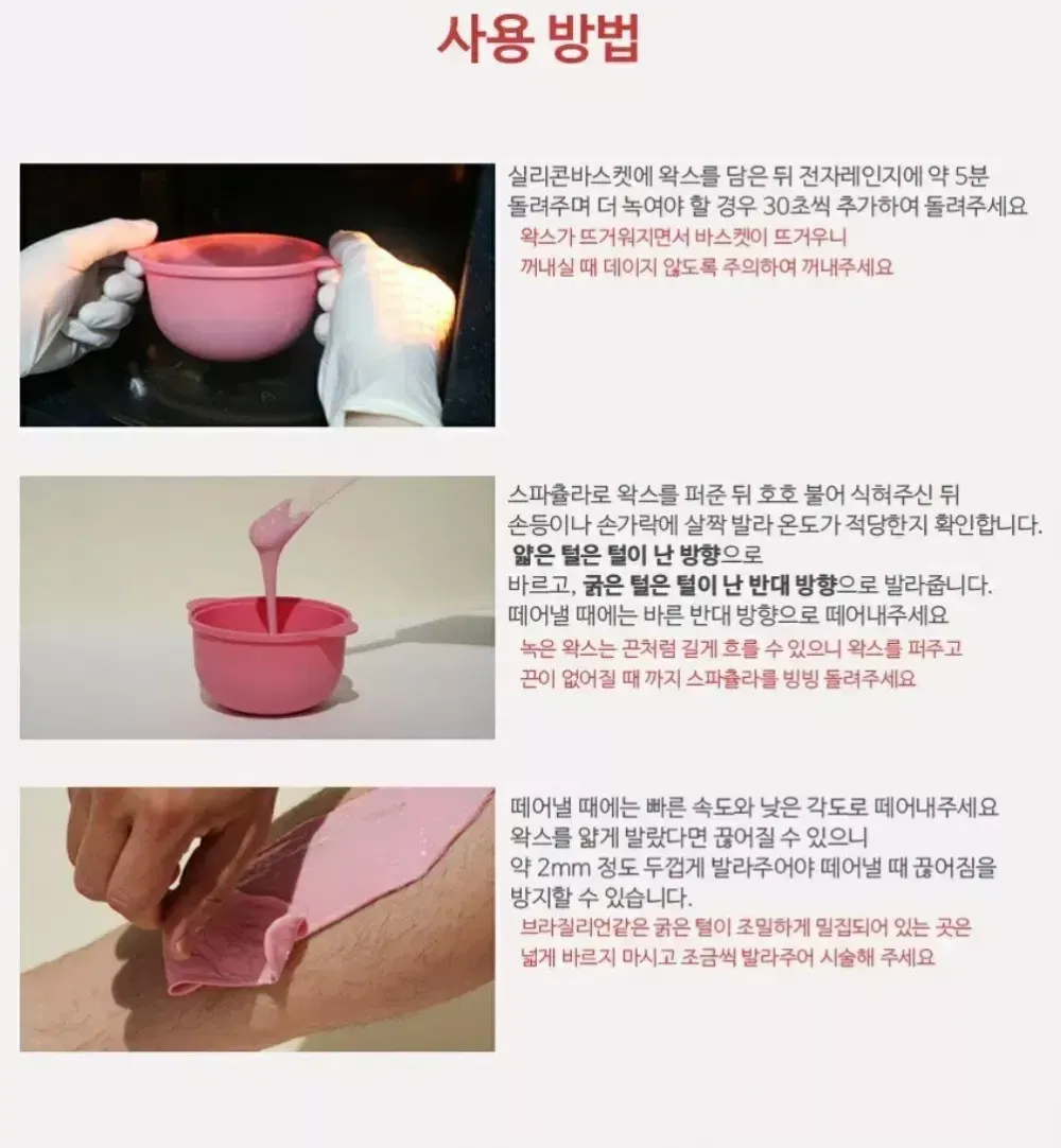 셀프왁싱 실리콘 왁스컵 3종 세트 : 9,000 (실리콘 컵 & 하드왁스 50g & 우드스틱 5개) ? 새상품 / 안전결제 바로 하시면 됩니다. 주문 후 익일이내 (영업일 기준) 발송합니다. 왁스만 추가로 구매하셔서 계속 ~사용하시면 되세요. https://link.bgzt.in/Baia ---‐--------? 3종세트 구성 1. 실리콘 바스켓 (1개 랜덤) : 워머기에 사용하셔도 되고 워머기 없는 셀프왁싱러분들 전자레인지에 사용하시기 좋아요. 2. 우드스틱 5개 : 2가지 사이즈 랜덤 혼합 대 (15*1.8 cm), 중(11.3*1.0cm) 3. 하드왁스 50g (1개 랜덤): 저자극 하드왁스로 눈썹,인중,얼굴,바디 등등 원하시는 부위 사용 가능 페이스(눈썹,콧털,인중,이마라인), 바디(겨드랑이, 팔,다리,브라질리언) 모두 사용하며 무향으로 색상별 차이 없습니다. -------- ? 50g 1팩 기준으로 페이스(눈썹,인중,수염,미간 등등) 3회가량 사용, 브라질리언, 바디 사용은 200g이상 추천합니다.! -개인차 (시술부위,모량,모질)시술자의 숙련도에 따라 다르니 익숙하지 않으신분은 넉넉히 구매하세요.