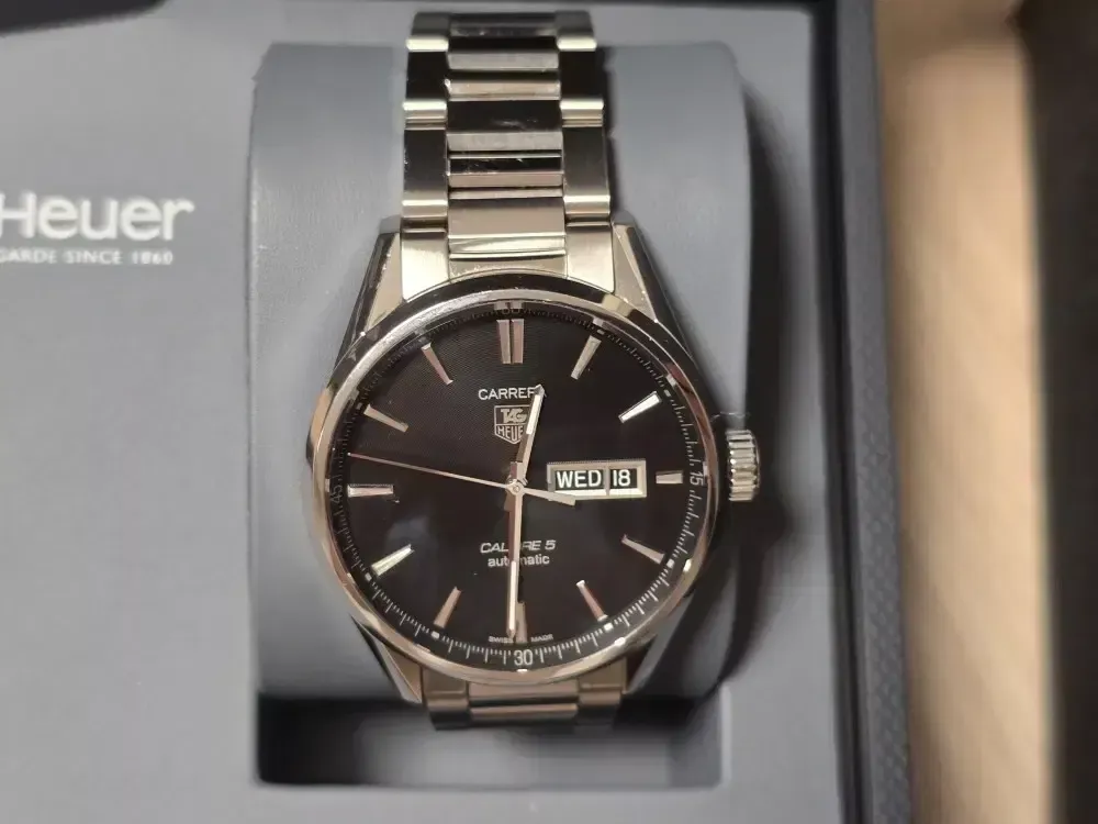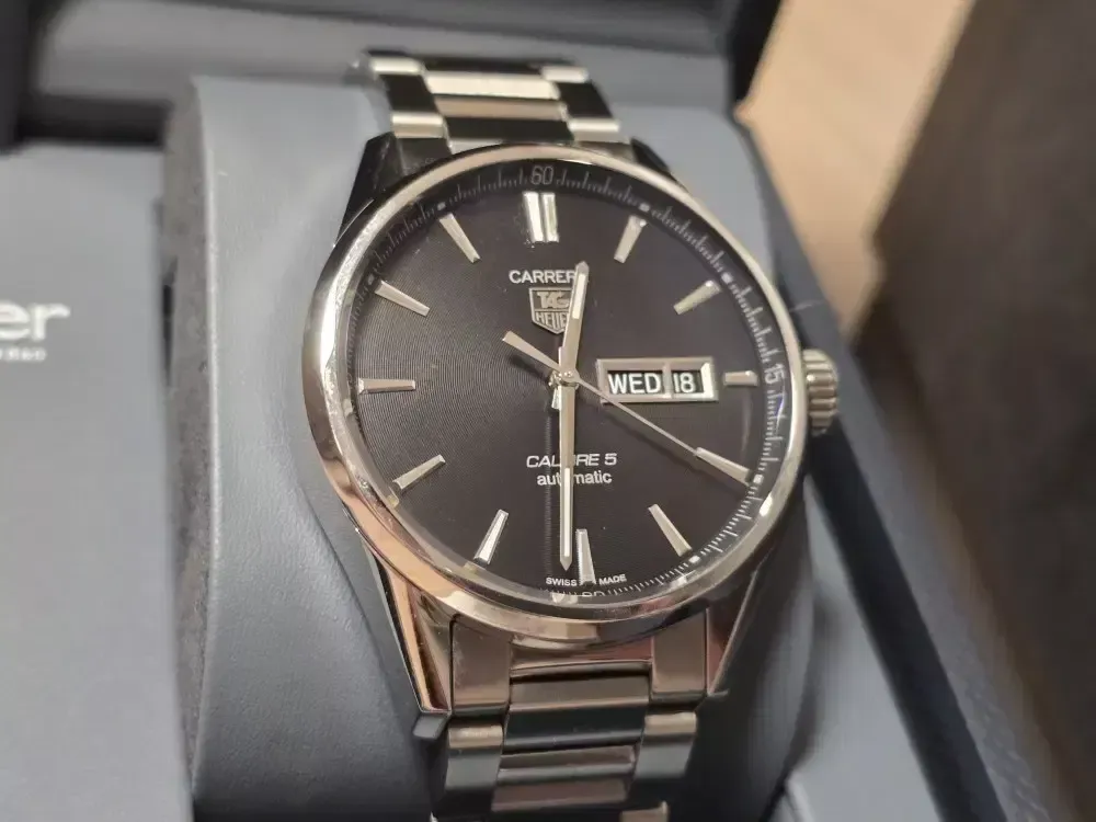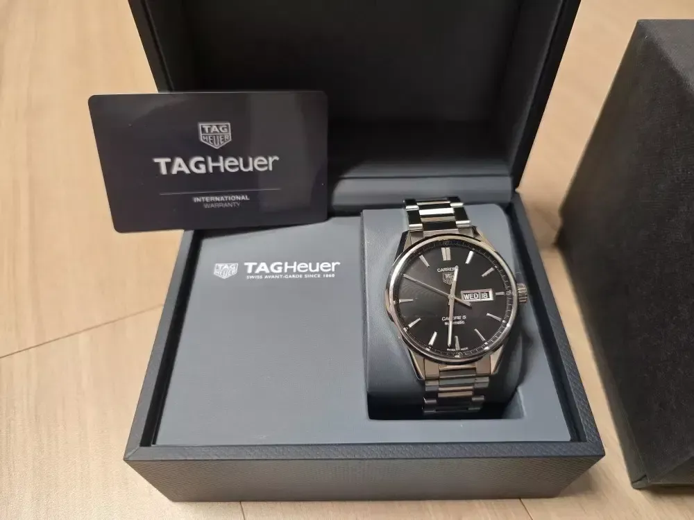 태그호이어 까레라 칼리버5 데이 데이트 41mm 오토 검판 입니다 2020년 7월 국내 스탬핑 으로 시계가 여러개라 돌려 차서 약간의 생활스크레치 외엔 퍼펙트한 상태 입니다 잠실 입니다 010 칠오사이 7112