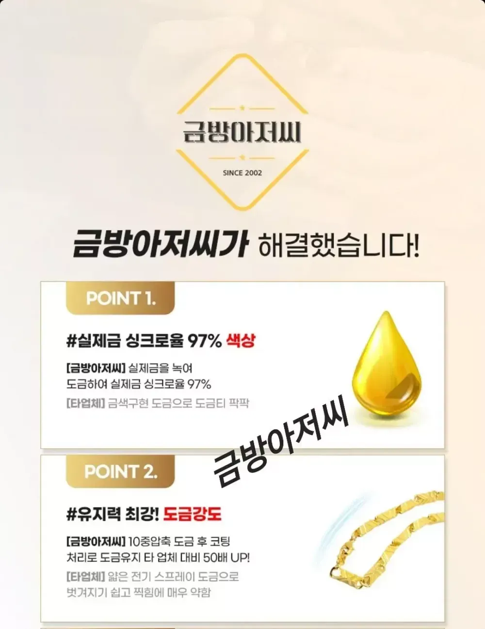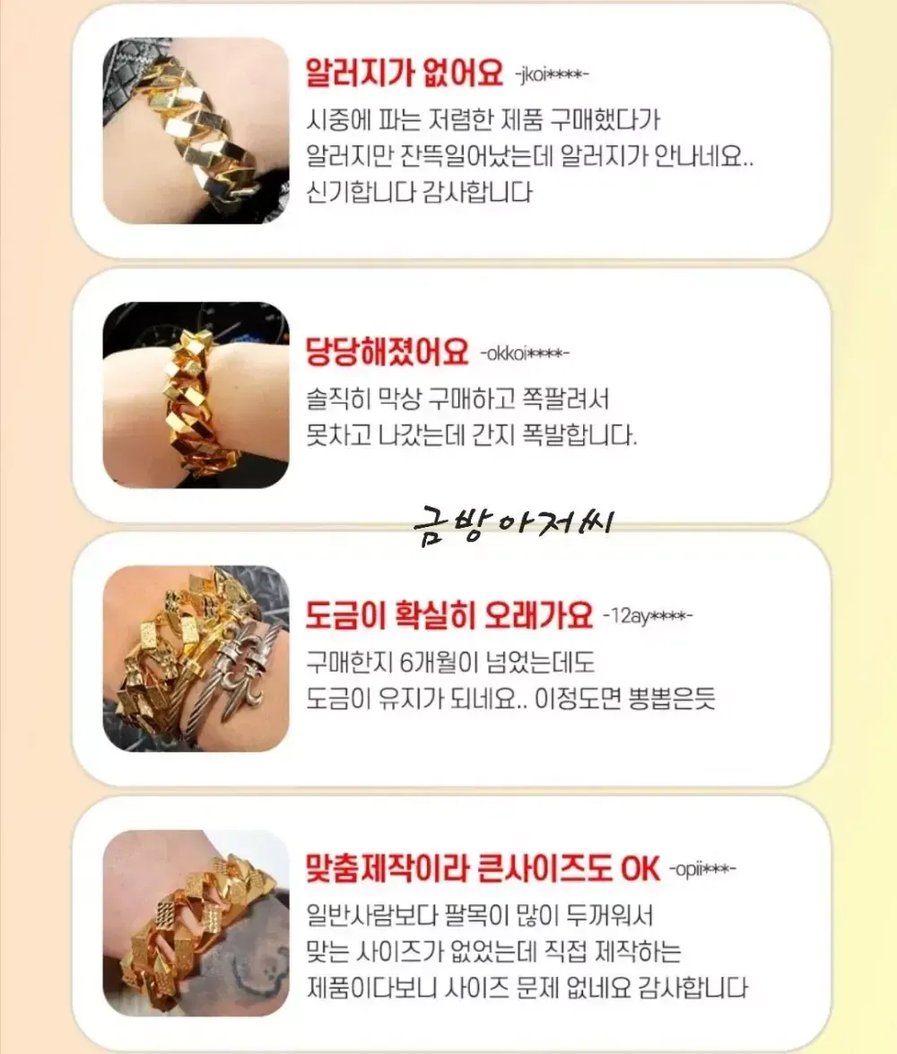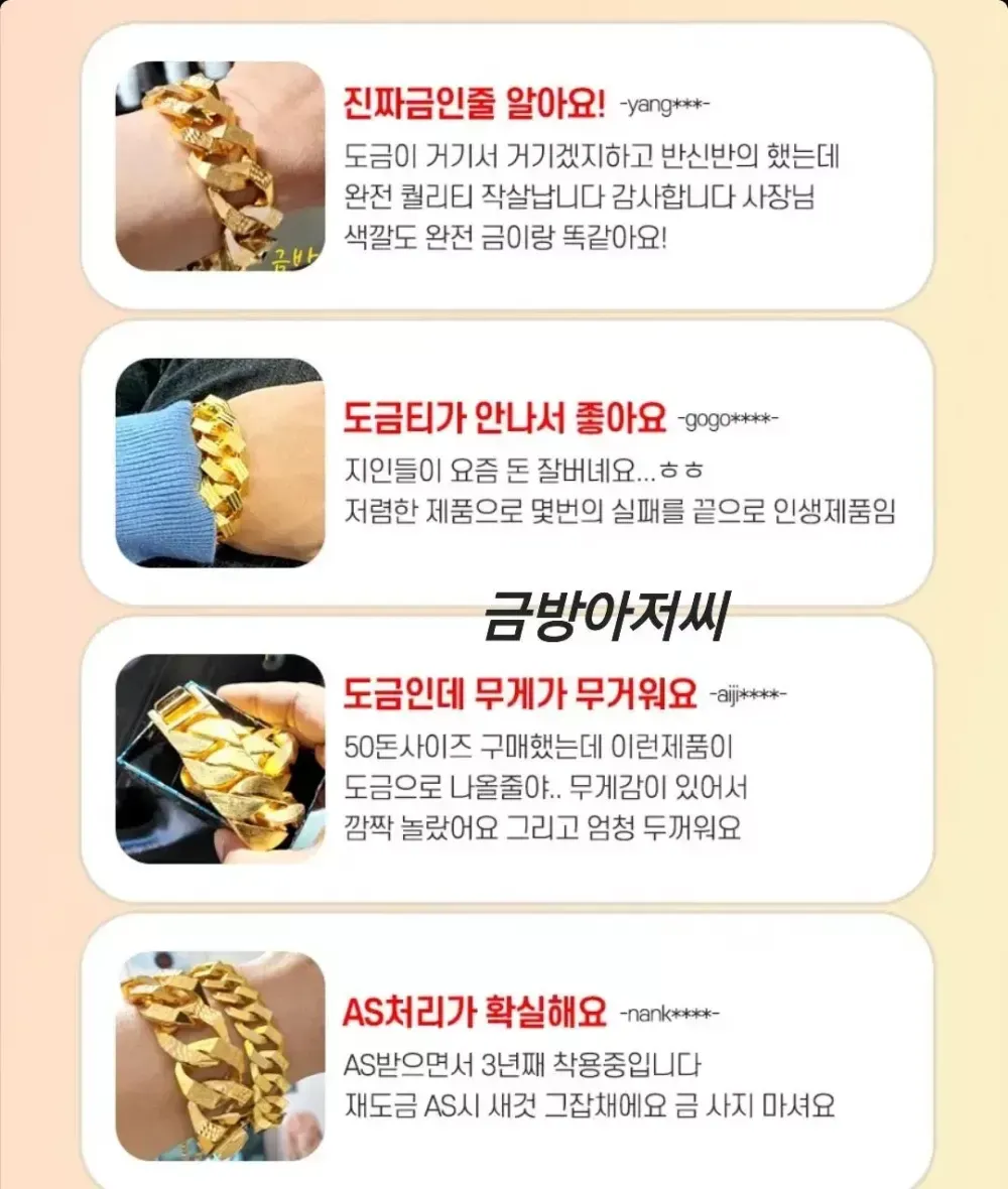 스지보카시 팔각체인팔찌 15미리 130,000원 18미리 140,000원 23미리 160,000원 선택옵션 18k750 & 24k999 각인추가 색감추가 각각 만원씩 추가 가능하십니다~^^ ?NEW 드디어 번개장터 입점!? 100%실제금 10중 압축도금 -20년경력 실제 금은방 세공 장인이 직접 제작하는 도금 ?국.내.최.초? -실제 금도금 & 금은방 디자인 길이 맞춤제작- -금방아저씨의 다양한 상품을 구경하세요- (링크) ❗️❗️이런적 있지 않으신가요❗️❗️ 1.시중에 파는 저가의 도금 구매후 1주일만에 버리셨다구요? 2.주변사람들에게 도금인걸 들킬까 두려우셨나요? 3.알러지가 생기셨나요? 4.사용한지 1주일도 안돼서 벗겨지셨나요? 5.금은방에서 나오는 디자인을 찾고 계신가요? 6.두꺼운 금팔찌, 금목걸이 차고 싶은데 가격이 너무 부담이라구요? ✅️금방아저씨가 해결했습니다✅️ 1.실제금 싱크로율 97% 색감 2.유지력 최강 도금강도/ 저가 동대문제품 비교불가 3.특수소재 신주 사용으로 묵직한 무게감 4.특수제작 코팅 알레르기 ZERO 5. 착용 후 변색이 되어도 평생 재도금AS 새 것 처럼 복구 6. 맞춤제작 다양한 사이즈! ------------------------------------ 선택 옵션 18k750 & 24k999 각인추가 순금색감추가 ( 추가 없을 시 기본 18k도금으로 제작!) 각각 만원씩 추가 가능! ------------------------------------ 교환/빈픔 안내 1. 주문즉시제작 제품이기 때문에 단숨 변심 교환 및 환불 불가능 합니다 신중한 구매 부탁드립니다 2. 잔기스, 들뜸현상 순금도 다 있습니다 잔기스, 미세한 오차 이런 부분은 하자가 아니니 반품 불가능합니다 3. 착용 시 알레르기 반응으로 환불 불가능합니다 실제 은 알러지, 금알러지가 있다고 하시면 해당 제품 구매 권장하지 않습니다. 1000명 중 1명 알러지 반응은 알러지 제품이라고 보기 어렵습니다. 4. 사이즈가 크거나 작으 실 경우 유상 AS요청 해주시면 다시 제작해서 보내드립니다 이에 동의 하실경우 구매 부탁드립니다.