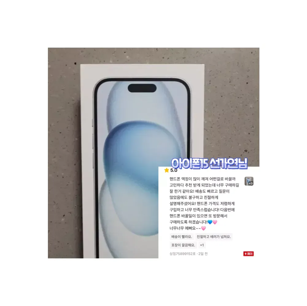 번개장터는 상점주인이 직접 후기를 삭제하거나 수정할수 없게 되어 있습니다 네*버/쿠*/옥* 처럼 후기를 조작했거나 거짓후기 일 시 자진 상점삭제 하겠습니다. ✔️번개장터 미개봉새상품 전문 프로상점 ✔️상점 팔로워 1만명 인증상점 ✔️상점 방문수 27만명 인증상점 ✔️번개페이 거래내역 999건+ 인증상점 ✔️상점평점 5점만점 후기 999건+ 인증상점 ?핫딜 이벤트 가격표? • 아이폰15+ -> "17만원" • 아이폰15 -> 상점 내 특가판매 • 아이폰15프로 -> 상점 내 특가판매 • 아이폰15프로맥스 -> 상점 내 특가판매 ♦️이벤트상품으로 재고소진 시 판매종료 됩니다. ?본 상점의 모든제품은 사용이력이 없는 미개봉새상품 입니다. ?모든상품 번개페이 안전결제 가능합니다. ?상품구매 후 1년 간 삼성/애플 공식 서비스센터에서 무상 보증서비스 가능합니다. ?구매순서는 번개톡문의 > 주문접수하기 > 재고확인 > 결제진행 > 택배발송 입니다. ?택배사는 CJ,로젠,우체국 택배사 이용 중 이며, 모든상품 무료배송 입니다. ?주문확정 시 1~3일 내 택배수령 가능하며, 서울/경기권 퀵서비스(고객부담) 가능합니다. ?리뷰작성 시 프리미엄 사은품6종SET (크리스탈케이스3개/크리스탈필름3개/젠더/케이블/휴대폰거치대/그립톡) 증정합니다. ?리뷰작성 시 매월 추첨 10명 에어팟프로 or 버즈프로 증정합니다. ?상담시간은 평일 오전10시~오후8시 이며, 주말은 휴무입니다. 상담량이 많아 답변이 늦더라도 양해 부탁드립니다. ?구매조건에 따라 금액이 변동될 수 있으니, 번개톡으로 1:1 문의 주시면 할인조건에 대해 설명드립니다. ?온라인 구매가 처음이라 구매 망설여지신다면, 실제 저희 고객님들 상점후기 확인해보시고 참고해보시면 좋습니다. ?번개장터 최상위(신용도 상위1%) 모범상점입니다. 안심하고 구매하세요♡ #특가 #선착순 #재고소진시 #이벤트종료 -할인안내 출고가 (1,342,000원) - 공시지원금 (500,000원) - 추가지원금 (75,000원) - 라이트제휴할인 (597,000원) = "판매가 170,000원" -사전승낙서 https://www.ictmarket.or.kr:8443/ajax/ajax3.do?id=PRE0000155098&seq=1&yn=1