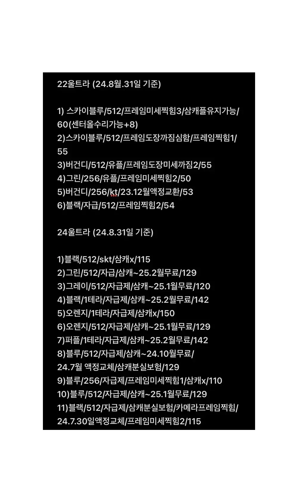 안녕하세요. 제 판매글 보시면 아시겠지만 울트라 대여 전문 프로 상점입니다. ? 울트라 대여 문의 내용은 링크 참고 ⬇️ https://link.bgzt.in/RHRS ? 판매 가격 사진 참조(24.8월 기준 작성) 가격 조율 가능 22/23/24울트라 업데이트 완료 ? 제가 판매하는 모든 울트라 기기들은 수령후 단순변심 포함 묻지마 환불 가능합니다.(파손이 없을 경우만 해당이 되고 울트라 대여비 받습니다.) ?판매 완료는 따로 고지하겠습니다. 이번 24울트라 구매 예정으로 기존 22, 23울트라 부분 정리 합니다. 모든 색상(스카이 블루, 그라파이트, 라임, 레드, 그린, 크림, 블랙, 라벤더, 스타벅스 에디션(크림), 버건디, 화이트), 용량은 256/ 512기가/ 1테라 가능하고 자급제, 통신사, 삼캐플 유무 다양합니다. 원하시는 모델과 가격대 문의 주시면 가능한 기기 사진 및 정보 드리겠습니다. 우선 다른 중고기기 대비 장점은 대여용(공연 촬영용)으로만 한달 평균 5일이하 사용으로 배터리 상태 매우 좋습니다. 하단바 없이 사용했고 항상 다크모드로 사용 대여일 제외 전원 오프후 보관만 해서 잔상이 없습니다. 기기 많습니다. 모든 기기를 판매하지는 않겠지만 문의 주시면 최대한 합리적인 가격에 가능한 기기로 추천해 드리겠습니다. 24울트라 사진 확인/ 1, 4, 5번 판매완료 23울트라 사진 확인/ 14번 판매완료 22울트라 사진 확인/ 4번 판매완료 ☑️ 기기 가격은 자급제/통신사용, 삼캐플 유무, 최초통화일 기준, 색상(삼성 단독컬러), 박스유무 차이로 판매가 조정이 있을수 있습니다. 구매 안하셔도 되고 부담없이 문의 주세요. 당근에도 글 올릴 예정이라서 문의가 많거나 해당 기기가 대여중일 경우 요청하신 기기 사진과 답변이 늦을수도 있습니다.