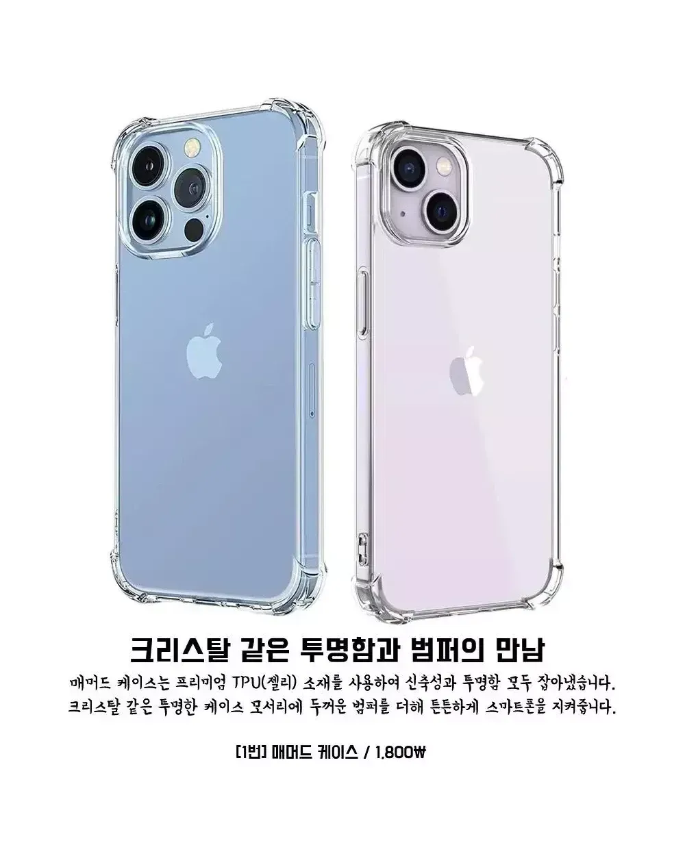 ✔️번개페이 배송비 변경 및 합배송 등 문의는 번개톡 부탁드립니다. ✔️배송비 우편 900~원 / 준등기 2000원 / GS25반값택배 2100원 / 일반택배 3000원(제주산간+3) ?1만원 이상 *첫*구매 시 GS반값택배 ●1500원● ?1만원 이상 *재*구매 시 GS반값택배 ●1800원● ?1만원 이상 구매 시 *우편* 무료배송 [ 유리필름 배송 불가X] ?3만원 이상 구매 시 *일반택배* 무료배송 ▪︎모든 유리 필름은 파손위험으로 택배배송만 가능합니다▪︎ ⬇️ㅡㅡㅡㅡ휴대폰케이스ㅡㅡㅡ⬇️ M1. 매머드 맥세이프 케이스(4500원)●(변색방지) 0.변색없는 3D 크리스탈 하드케이스(3900원)● 1.불사 매머드 케이스(1800원)● 2.불사 매머드 카드케이스(2900원)●(변색방지) 3.불사 매머드 하드케이스(3900원)●(변색방지) 4.불사 카메라 풀커버 케이스(3500원)●(변색방지) ⬇️ㅡㅡㅡㅡ전면 필름ㅡㅡㅡㅡ⬇️ 5.방탄 강화유리필름/우레탄필름(1000원) 6.방탄 강화유리 풀커버필름(아이폰)(2500원) 6.방탄 강화유리 풀커버필름(갤럭시)(3000~4000원) ⬇️ㅡㅡㅡㅡ다기능 전면 필름ㅡㅡㅡㅡ⬇️ 6-1.*사생활 보호* 방탄 강화유리 풀커버 필름(아이폰)(3000원) 6-2.*지문방지* 방탄 강화유리 풀커버 필름(아이폰)(3000원) 6-2.*지문방지* 우레탄 풀커버 필름(갤럭시)(3000원) 6-3*사생활*+*지문방지* 방탄 강화유리 풀커버 필름(아이폰)(5000원) ⬇️ㅡㅡㅡㅡ카메라필름/후면필름ㅡㅡㅡㅡ⬇️ 7.강화유리 카메라 보호필름(1900원) 8.아이폰11~14 시리즈 풀커버형 카메라보호필름(2500원) 9.갤럭시/아이폰 후면 기스방지 우레탄 필름 (1000원) 10.아이폰 후면 강화유리필름(2500원) 11.아이폰12~14 시리즈 후면/측면 기스방지필름(2000원/1500원) ⬇️ㅡㅡㅡㅡ기타 악세사리/충전ㅡㅡㅡㅡ⬇️ 12.아이폰 홈버튼 필름(1000원) 13.에어팟 실리콘 케이스/18K철가루방지 스티커(1500원) 14.10W 8핀/C타입 고속충전케이블(2000원) 15.10.5W 8핀/C타입 고속충전기(3900원) 16.3in1 고속충전 케이블(3900원) 17.8핀/C타입 이어폰 변환 젠더(3900원) 18.충전 케이블 변환젠더(500원) 19.스마트톡(1300원) 20.맥세이프 자석 / 철판(5000원/1500원) ⬇️ㅡㅡㅡㅡ아이패드/애플워치ㅡㅡㅡㅡ⬇️ A.아이패드 투명 범퍼 젤리 케이스 (5000~6000원) B.아이패드 전면 강화유리 필름 (6000~7000원) C.애플워치 투명 풀커버 강화유리 케이스(3000원) D.애플워치 풀커버 액정보호필름(2500원) ●모든 상품들은 상점에 상품상세글, 상세사진이 따로 있습니다.● ●간단 참고사항 -우편, 준등기로 배송된 제품에 대해서는 분실/파손시 어떠한 보상도 불가하며, 단순변심환불이 불가합니다. -자잘한 하자, 단순 기스는 불량사유가 아닙니다. 공정,운반중에 자연스레 발생하는 현상이며, 노마진 판매인만큼 자잘한 하자로는 AS가 불가합니다. 민감하신분들은 구매 자제부탁드립니다. -환불은 상점 교환환불정책에따라 진행됩니다. ●배송별 간단 안내 -우체국 우편 (900~) 송장발급X/배송전연락X/불예측배송 배송기간 3~20일 -우체국 준등기 (2000원) 송장발급O/배송전연락X 배송기간 1~5일 -GS25 반값택배 (2100원) 송장발급O/GS25편의점으로만 배송 가능 배송기간 1~3일 -일반택배 (3000원) 송장발급O/배송전연락O 배송기간 1일 -우체국 택배 (4300~원) 군부대배송가능 배송기간1일 ●자주 오는 질문 Q: 일반 매머드 와 매머드 하드 의 차이점이 무엇인가요? A: 일반 매머드 는 독일산TPU단일 소재, 매머드 하드 는 PC+TPU혼합 소재로 변색 방지 효과가 있습니다. 추가로, 매머드 카드 케이스도 TPU단일 소재입니다. ●크리스탈 하드케이스는 전체가 PC소재이고, 모서리에 범퍼가 없는 깔끔한 투명케이스 입니다. 기본 매머드 케이스 상품정보 [재질 TPU] [제조국 CHINA] [제조사 ISK]