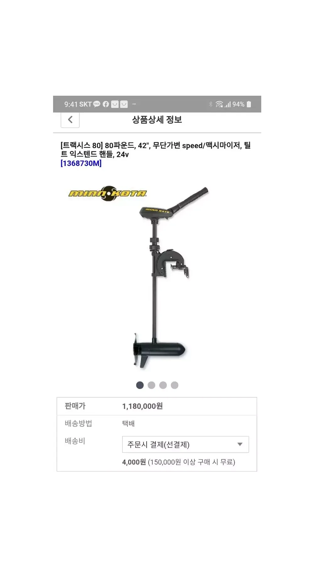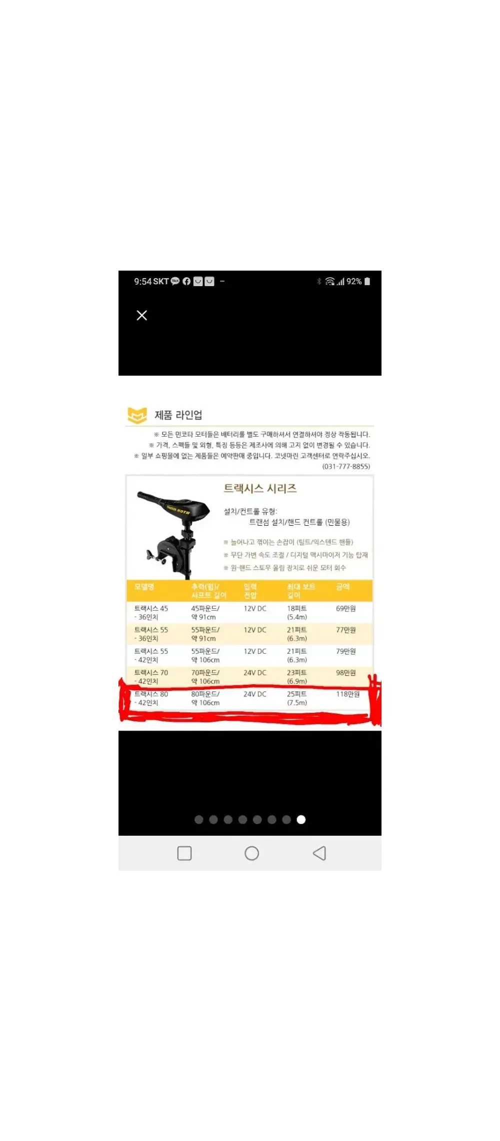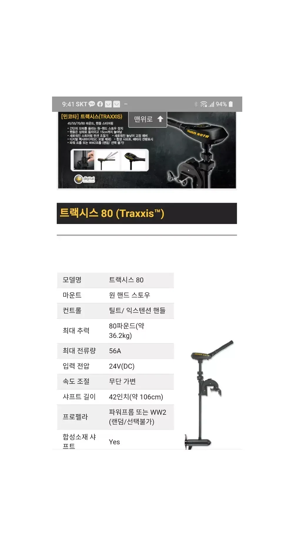 트랙시스 80] 80파운드, 42", 무단가변 speed/맥시마이저, 틸트 익스텐드 핸들, 24v. 백곡저수지와 평택호에서 7~8회 사용했습니다.. 지금은 평택호는 낚시금지입니다.^^;; 외관은 이동중 또는 사용중 생긴 소소한 스크래치정도입니다.. 구입처는 코넷마린입니다..