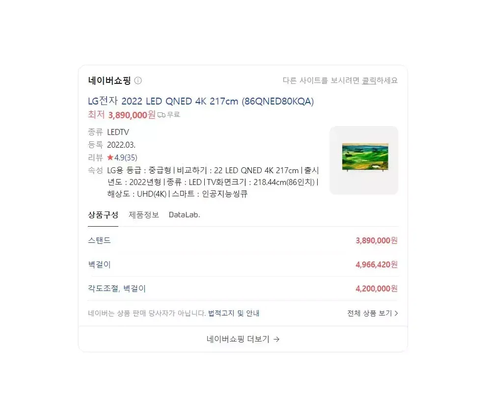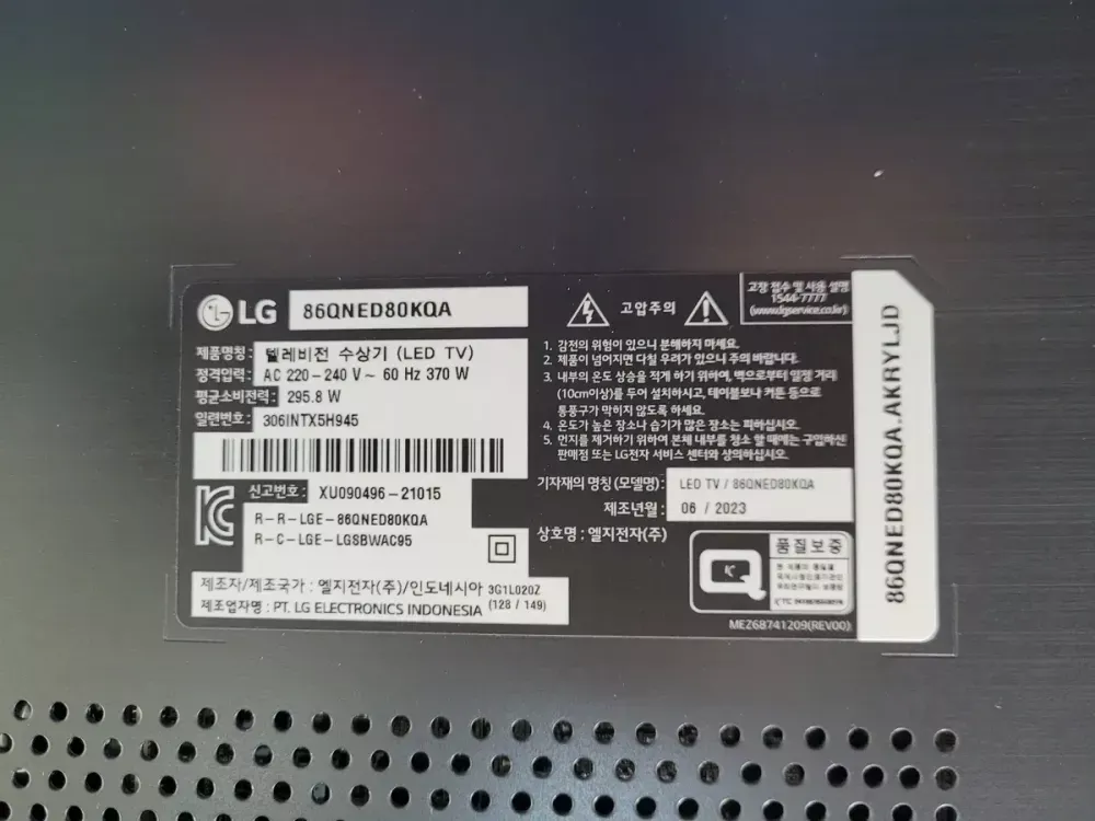 엘지 86인치(218cm) QLED TV 86QNED80KQA LG 86QNED80KQA 86인치(218cm) -기본 스탠드 사양입니다. -벽걸이나 스탠드 없는 제품 원하시면 연락주세요. 1. 방문수령_고객직접픽업 (경기도 고양) 2. 수도권_배송(+100,000원) 3. 수도권_배송설치(+150,000원) 4. 지방권_배송 (+150,000원) 5. 지방권_배송설치 (+200,000원) 중고상품이 아닌 박스만 개봉된 미사용 상품입니다. 현재 인터넷 최저가 380만원 선입니다. 제품 상세설명 모델명: 86QNED80 크기: 86인치