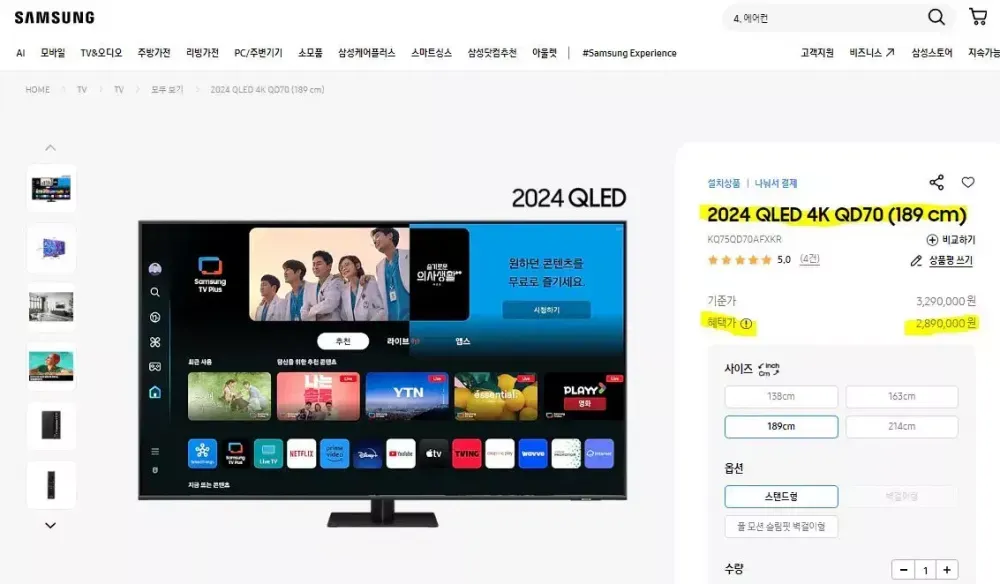 박스만 개봉된 새제품 입니다. 정상 AS 됩니다. 삼성 QLED TV KQ75QD70AFXKR 189cm (75) 현재 삼성공홈에서 메인으로 판매되고 있으며 판매가는 최고혜택가 기준 289만원입니다. 배송 설치 포함기준 100만원 이상 싸게 구매하시는 겁니다. 제조 : 2024년 2월 -기본 스탠드 사양입니다. -벽걸이 원하시면 연락주세요. 1. 방문수령_고객직접픽업 (경기도 고양시 용두동) 2. 수도권_배송(+100,000원) 3. 수도권_배송설치(+150,000원) 4. 지방권_배송 (+150,000원) 5. 지방권_배송설치 (+200,000원) 중고상품이 아닌 박스만 개봉된 미사용 상품입니다.