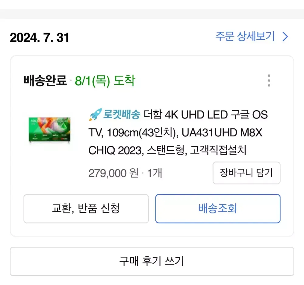 8/1에 쿠팡에서 산 더함 치크(chiq) 43인치 팝니다. 2주 정도 쓰고 박스에 넣어두었습니다. UA431UHD M8X CHIQ 2023 모델입니다. 수원에서 직거래 합니다~