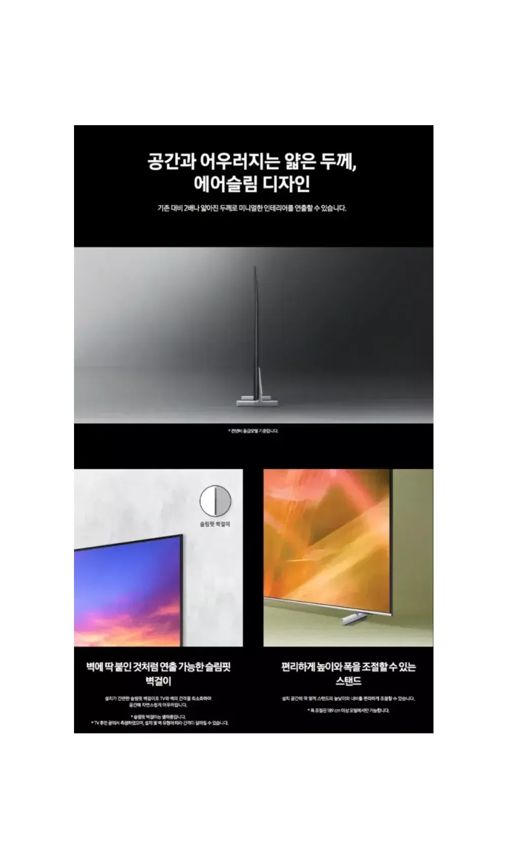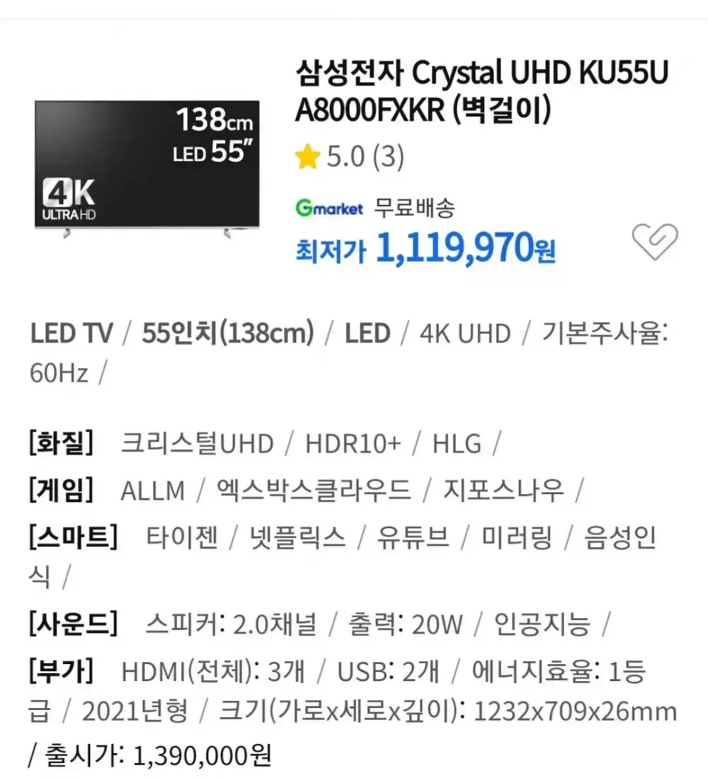 삼성 55인치 Crystal UHD 8000 스마트 TV 모델명 KU55UA8000FXKR 2021년 4월 제조 국내정품 입니다. 가장 얇게 만들어진 LED TV 입니다. 상태S급 입니다. 사용시간 적네요. 스탠드형이고 스마트리모컨 포함입니다. 넷플릭스 이하 모든 OTT 가능합니다. 서울 강동구 성내동입니다. 가까운 지역은 배송해드립니다. LED TV/55인치(138cm)/LED/4K UHD/기본주사율: 60Hz/ [화질] 크리스털UHD/HDR10+/HLG/ [게임] ALLM/엑스박스클라우드/지포스나우/ [스마트] 타이젠/넷플릭스/유튜브/미러링/음성인식/ [사운드] 스피커: 2.0채널/출력: 20W/인공지능/ [부가] HDMI(전체): 3개/USB: 2개/에너지효율: 1등급/2021년형/크기(가로x세로x깊이): 1232x709(749)x26(227)mm