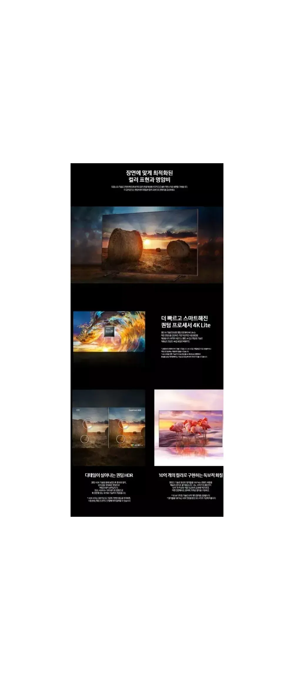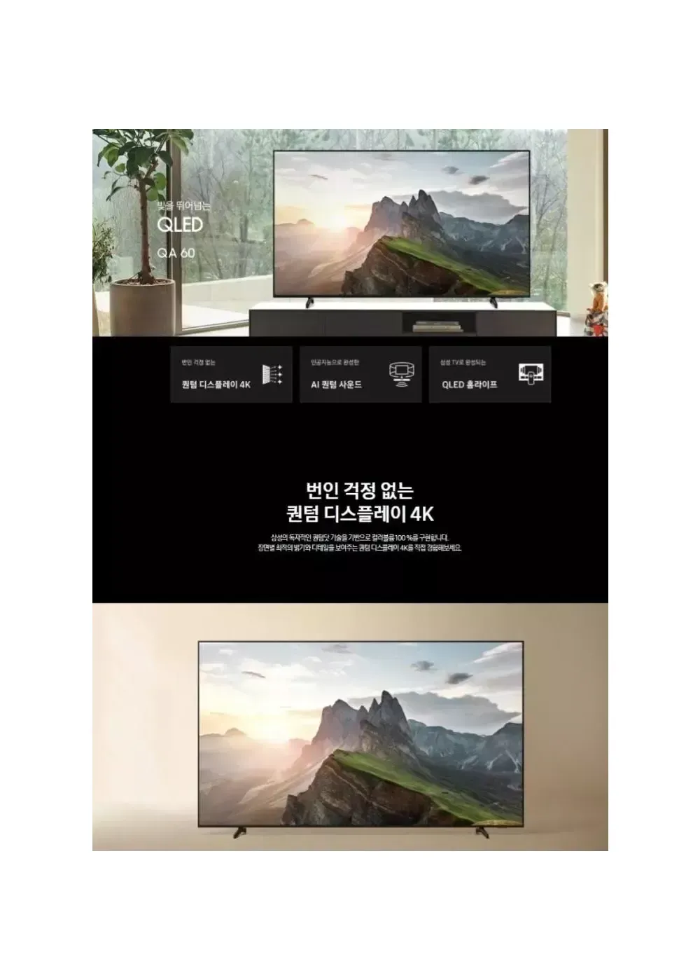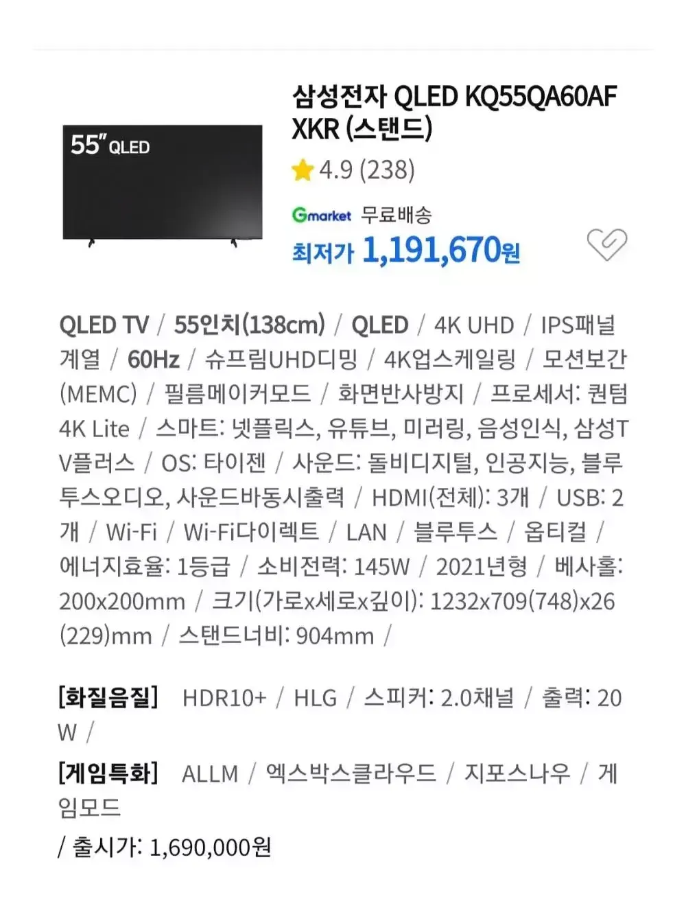 삼성 QLED 55인치 4K UHD 스마트 TV 모델명 KQ55QA60AFXKR 2021년 7월 제조 국내정품입니다. 삼성전자에서 액정 신품 교환해서, 2024년 12월 30일까지 무상패널 보증가능합니다. 전면, 베젤에 보호비닐 새것처럼 부착되어 있어요. 넷플릭스, 디즈니, 유투브, 왓챠, 티빙, 웨이브, 아이폰 미러링, TV PLUS 등 모두 지원됩니다 스탠드형(신품) , 벽걸이형 선택 가능합니다. 태양광 충전식 스마트 리모컨 포함입니다. 서울 강동구 성내동입니다. 가까운 지역은 배송해드립니다. QLED TV/55인치(138cm)/QLED/4K UHD/IPS패널계열/60Hz/슈프림UHD디밍/4K업스케일링/모션보간(MEMC)/필름메이커모드/화면반사방지/프로세서: 퀀텀4K Lite/스마트: 넷플릭스, 유튜브, 미러링, 음성인식, 삼성TV플러스/OS: 타이젠/사운드: 돌비디지털, 인공지능, 블루투스오디오, 사운드바동시출력/HDMI(전체): 3개/USB: 2개/Wi-Fi/Wi-Fi다이렉트/LAN/블루투스/옵티컬/에너지효율: 1등급/소비전력: 145W/2021년형/베사홀: 200x200mm/크기(가로x세로x깊이): 1232x709(748)x26(229)mm/스탠드너비: 904mm/ [화질음질] HDR10+/HLG/스피커: 2.0채널/출력: 20W/ [게임특화] ALLM/엑스박스클라우드/지포스나우/게임모드 / 출시가: 1,690,000원